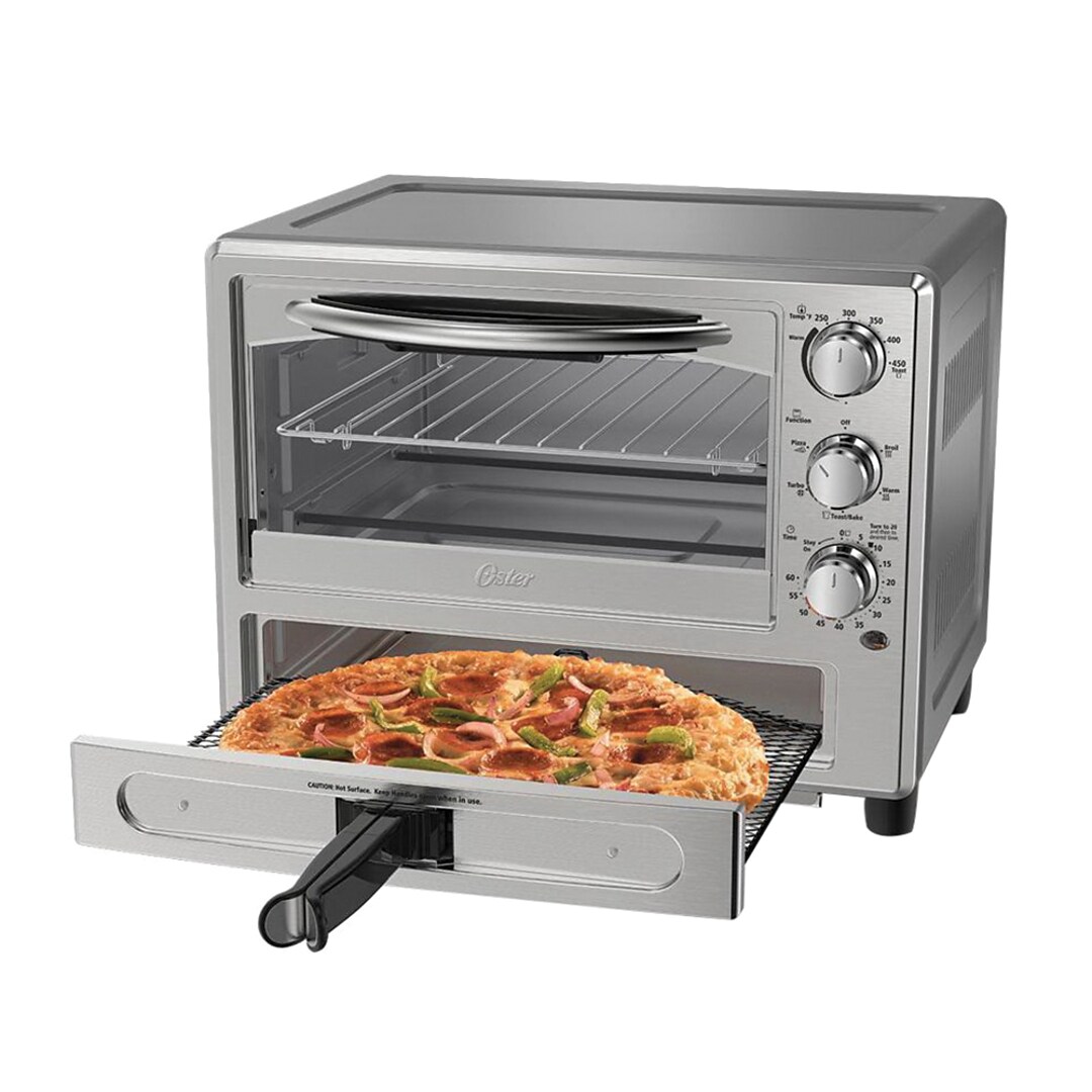 Black decker to1675b 6 slice convection countertop toaster oven includes bake pan broil rack toasting rack stainless steel black convection toaster oven 4 1 out of 5 stars 825 51 65 51. With the help of its 60 minute timer you can bake broil toast and keep warm functions on the toaster oven. The set includes an oven rack a bake pan and a broil. This large convection toaster oven has the ability to cook whole 9 inch pizzas with ease.