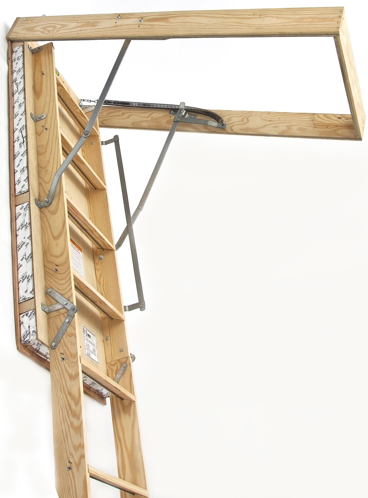 Our factory installed insulating panel is more durable and less likely to become damaged. Our factory applied weather stripping has the following properties. Built for safety this sturdy wood ladder makes it easy to access your attic with nine non slip steps and a convenient handrail for support while climbing. Weight capacity designed to fit ceiling heights from 8 ft.